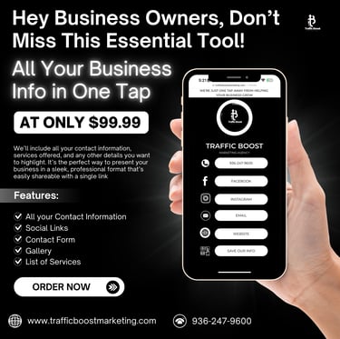 At Traffic Boost Marketing Agency, we excel in creating strategies that drive your business forward. From dynamic social media content to effective print materials, we handle all your marketing needs to ensure your success in the digital age. Let us turn your vision into reality!